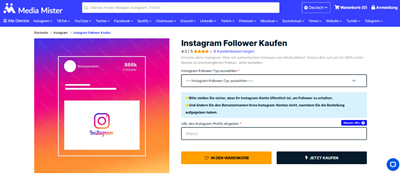 Media Mister ist eine etablierte Plattform mit über einem Jahrzehnt Erfahrung im Bereich Social-Media-Wachstum. Die Website bietet eine sichere Möglichkeit,echte Instagram-Follower zu kaufen,wobei der Fokus auf aktiven,organischen Followern liegt,die eine hohe Bindungsrate gewährleisten. Eine der größten Alleinstellungsmerkmale von Media Mister ist die 100% Geld-zurück-Garantie,die den Käufern enorme Sicherheit gibt. Zudem wird ein engagierter Live-Chat-Support angeboten,der bei Fragen oder Problemen schnell weiterhilft.