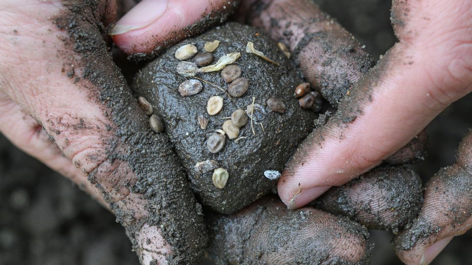 Eine Frau formt aus feuchter Erde und Samen eine sogenannte Saatbombe: Häufig stecken darin anders als versprochen keine heimischen Blumen
