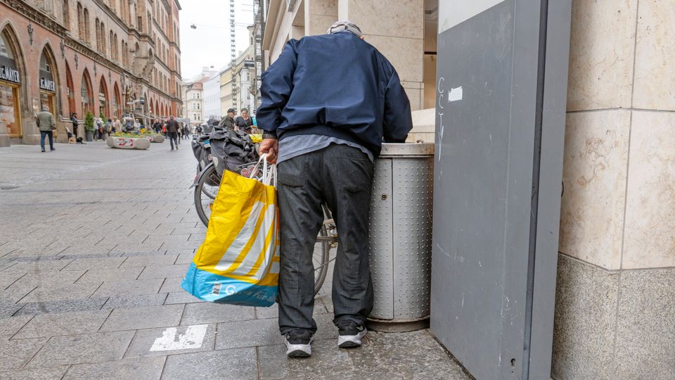 Älterer Mann beim Sammeln von Pfandflaschen in München